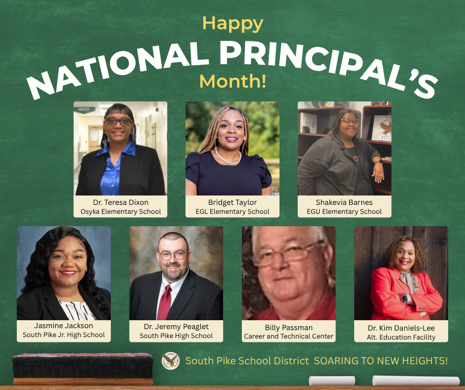 🎉 October is National Principals’ Month, and we at South Pike School District are thrilled to celebrate our remarkable leaders! A huge thank you to Dr. Teresa Dixon (Osyka Elementary), Bridget Taylor (Eva Gordon Lower Elementary), Shakevia Barnes (Eva Gordon Upper Elementary), Jasmine Jackson (South Pike Junior High), Dr. Jeremy Peagler (South Pike Senior High), Billy Passman (Director, South Pike Career and Technical Center), and Dr. Kim Daniels-Lee (Director, Alternative Education Facility). Your hard work and dedication make a world of difference for our students and community. 🌟📚