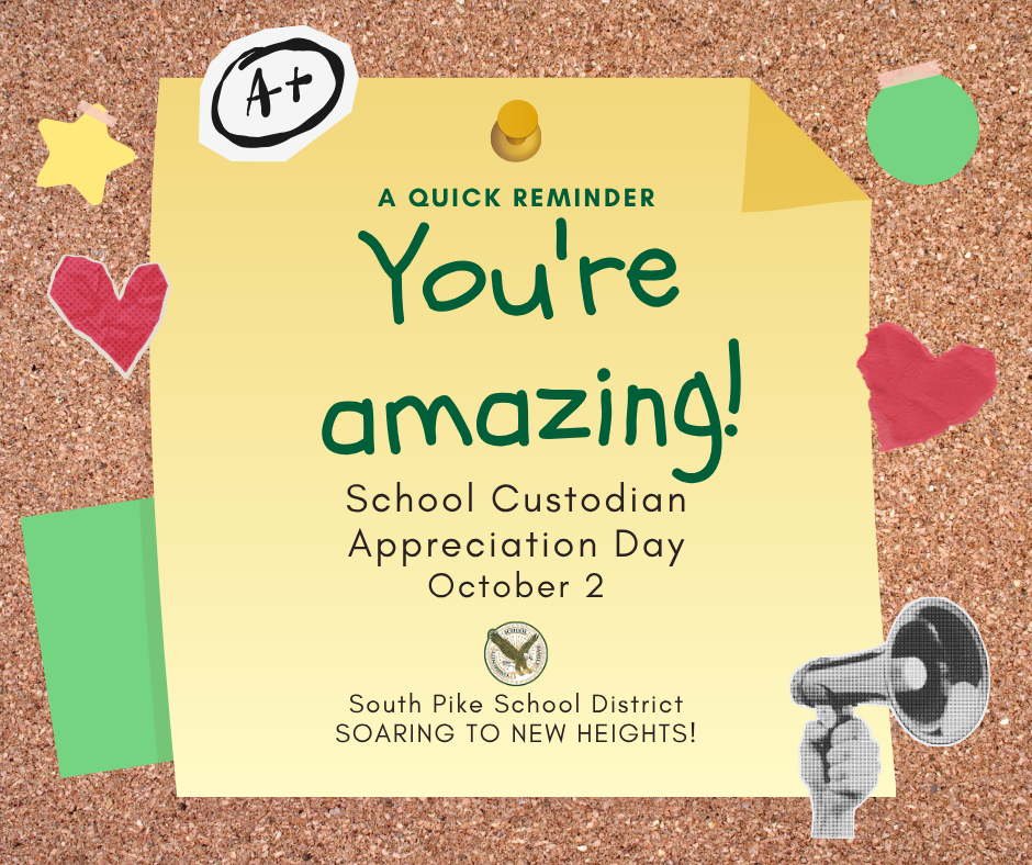 Today is School Custodian Appreciation Day, and we at South Pike School District are thrilled to honor our hardworking custodians! Their dedication keeps our schools clean, safe, and welcoming for everyone. Let's show them our gratitude and appreciation today and every day. Thank you for your tireless efforts and commitment to our community! 🙌💚 #CustodianAppreciationDay #SouthPikePride