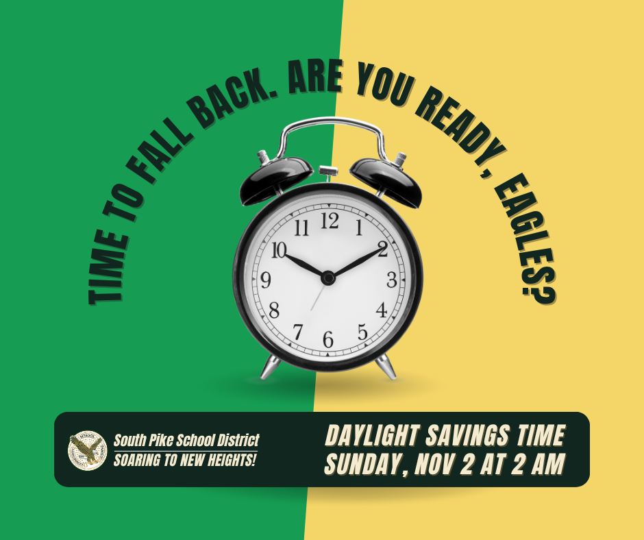Attention South Pike School District community! This Sunday, November 2, 2025, marks the end of daylight saving time. Remember to set your clocks back one hour from 2 a.m. to 1 a.m. and enjoy an extra hour of sleep. This is a great time to check batteries in smoke detectors, too. Have a restful weekend!