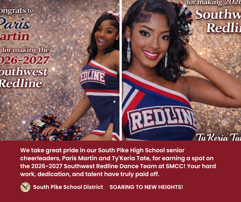 Weβre thrilled to announce that our exceptional South Pike High School senior cheerleaders, Paris Martin and Ty'Keria Tate, have secured a coveted spot on the 2026-2027 Southwest Redline Dance Team at SMCC! Your dedication, talent, and hard work have truly paid off. We couldn't be prouder of your achievements. Keep soaring to new heights! π #SouthPikePride #SoaringToNewHeights